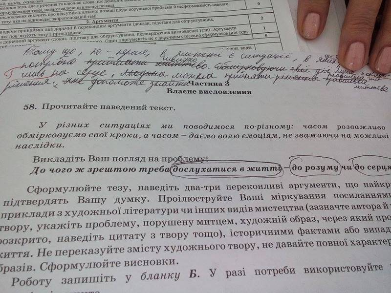 Тест з української мови і літератури є обов’язковим, тобто його складають усі, і навіть ті, хто не планує здобувати майбутній фах у вищому навчальному закладі. Думки про складність його завдань традиційно розділились. Як завжди, було чимало випускників та їхніх батьків, котрі наголошували на винятковій складності завдань, інші ж тихо стверджували: завдання прості, тому не варто нагнітати і так напружену атмосферу під час іспиту. Тема власного висловлювання — «До чого ж, зрештою, треба дослухатися в житті — до розуму чи до серця?» — також викликала неоднозначні думки. А після оприлюднення результатів — і взагалі невдоволення. Чимало вступників, їхніх батьків та вчителів були вражені доволі низькою оцінкою за цю частину тесту, яка, до речі, оцінюється максимально в 20 балів. Тож найбільш відважні та впевнені абітурієнти подавали апеляції на результат і таки змогли «вибороти» кілька балів: хтось лише 2, а хтось аж 8. Вам не здається дивним, що за максимальної вартості відкритого завдання в 20 балів апелянти відсуджували 8 — майже половину?