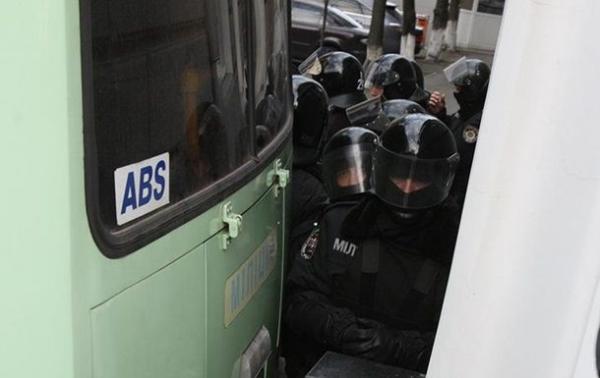 Як передає кореспондент УНІАН, автобуси стоять з працюючими двигунами. За ними перебувають бійці Беркута в шоломах і зі щитами.