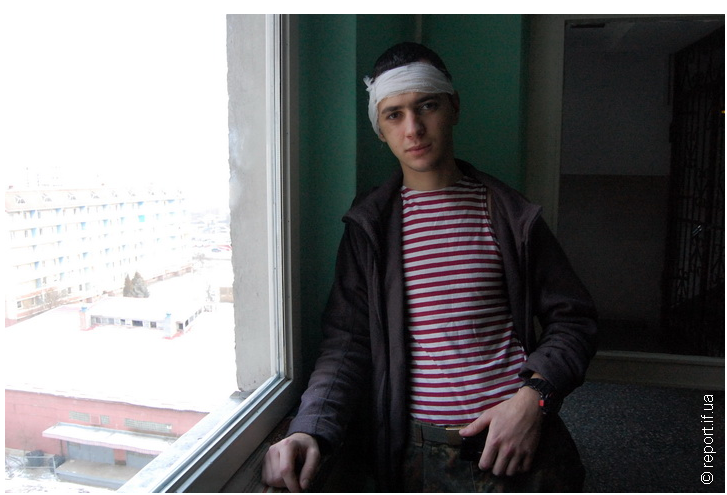 По телефону Андрій обіцяє вийти на коридор. Виглядаємо його за прозорими дверима відділення. Поки там видно, як санітарка миє підлогу, туди-сюди ходять люди в білих халатах. З-поміж них у кінці коридору помічаємо худого хлопчину з перемотаною бинтом головою. Одягнений у тільняшку, камуфляжні штани. На ходу на плечі накидає светра. Це і є боєць 4-го батальйону оперативного призначення Андрій Сушко. Нещодавно йому зробили операцію. Потрапив у лікарню з діагнозом «гострий хронічний гнійний отит».