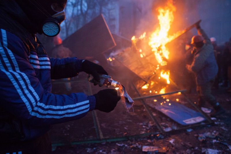 Вночі знову горять шини, знову «Беркут» намагається їх гасити. Інколи, але не дуже активно, з барикад летять пляшки з сумішшю, звідти у відповідь, так само без ентузіазму, гранати. Активісти, використавши свій боєкомплект, збуджено повертаються на Майдан і йдуть змивати кіптяву з облич у Будинок профспілок. А на їхнє місце заступає черговий загін повстанців.