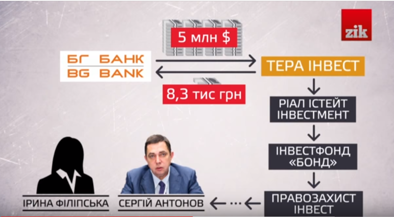 Виведення цих грошей розпочалося ще 4 листопада 2014 року. Тоді банк, який входив у зону інтересів сина екс-генпрокурора Віктора Пшонки Артема, продав ці облігації внутрішнього державного займу компанії "Тера Інвест" з групи "Перспектива", заснованій структурами дніпропетровських бізнесменів Сергія Антонова та Ірини Філіпської.
