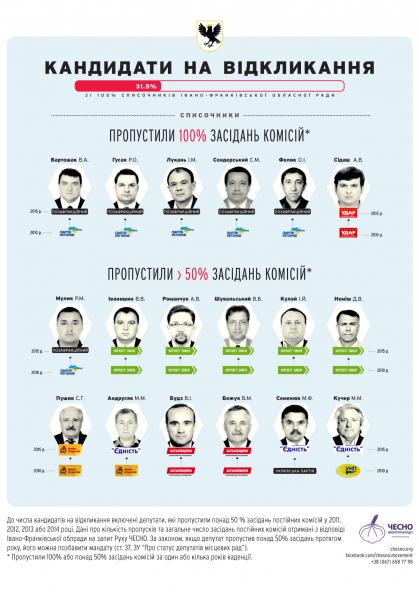 Найільше кандидатів на відкликання Громадський рух ЧЕСНО традиційно виявив під час моніторингу відвідуваності комісій (клікнути на графіку, щоб збільшити). У Івано-Франківській області таких понад 30 % списочників.