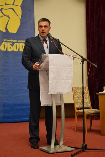 ...А починалося все в форматі свята. Серед присутніх на зустрічі було багато депутатів-"свободівців" Івано-Франківської міської, обласної та районних рад. Дехто прийшов із сім'ями. На вході дівчата у вишиванках роздавали "клубну атрибутику": календарі із зображенням Тягнибока, його книжку та прапорці.
