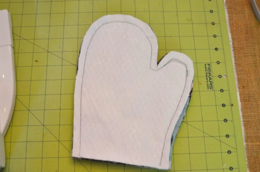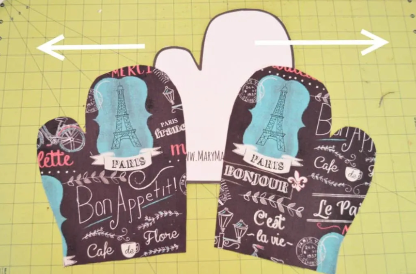Далі вам потрібно буде вирізати по дві деталі з трьох різних матеріалів, а саме основної тканини, підкладки та ватину. Потрібно вирізати деталі так, щоб у однієї з заготівок великий палець був спрямований ліворуч, а інший – вправо.
