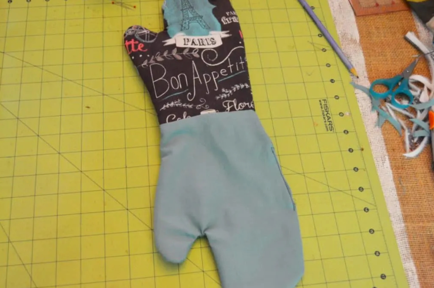 Протягніть зовнішню частину кухонної рукавиці через отвір у підкладці, щоб вивернути її на лицьову сторону. Потім зашийте отвір у підкладці на швейній машинці або вручну.