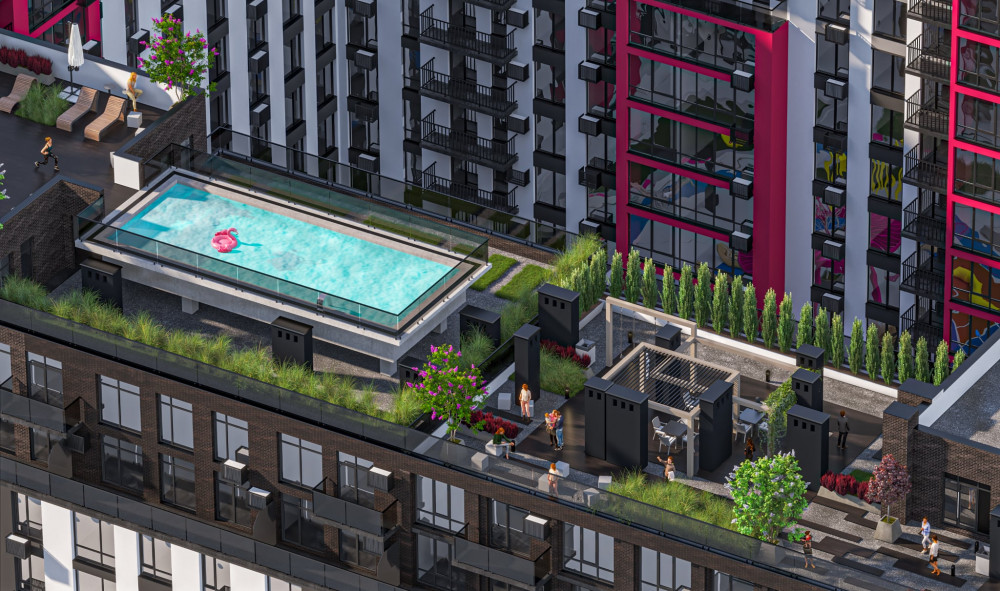 Житло преміумкласу з басейном на даху будинку, дизайнерськими холами, дворівневим підземним паркінгом. На території ЖК – приватні дитячий садок та школа.
