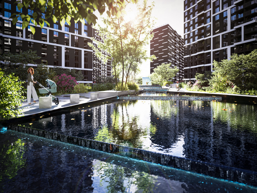Цей ЖК вирізняється великою рекреаційною зоною з озером та одними з найкращих у місті краєвидів із верхніх поверхів будинків. В проєкті – закритий двір, спортивне поле, торговий центр, дворівневий підземний паркінг.