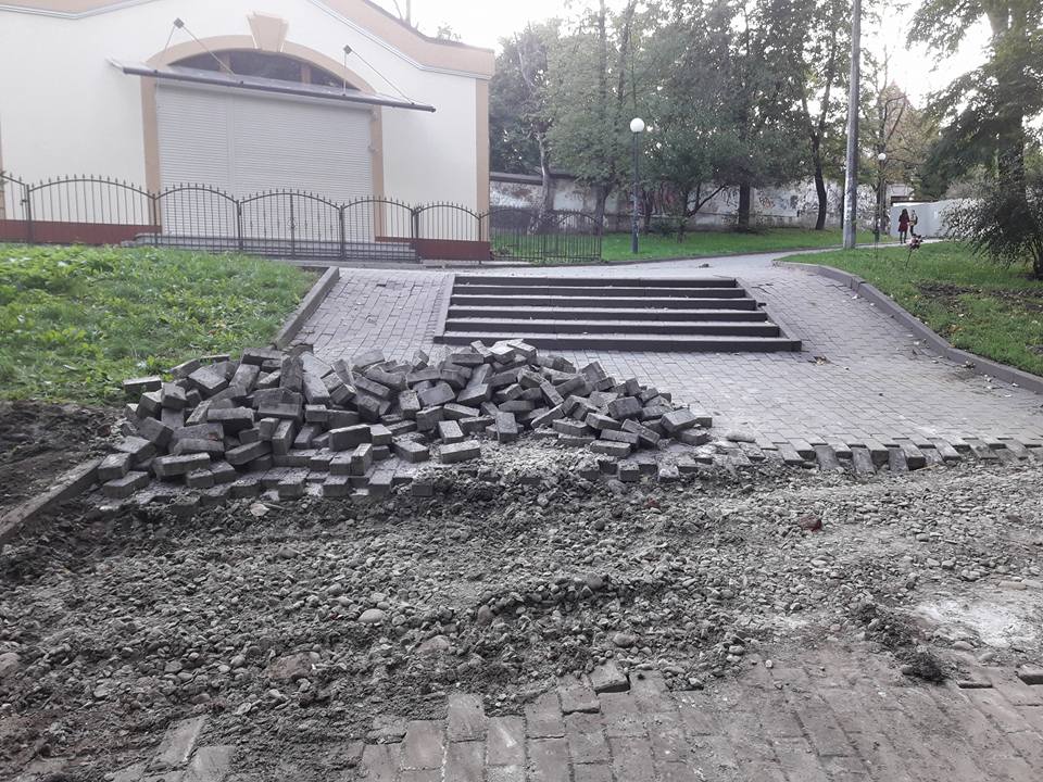 Перекопані схили і трава, зіпсовані забруковані доріжки, сходи – так виглядають зараз Вали. Біля Палацу Потоцьких в Івано-Франківську проводяться розкопки.