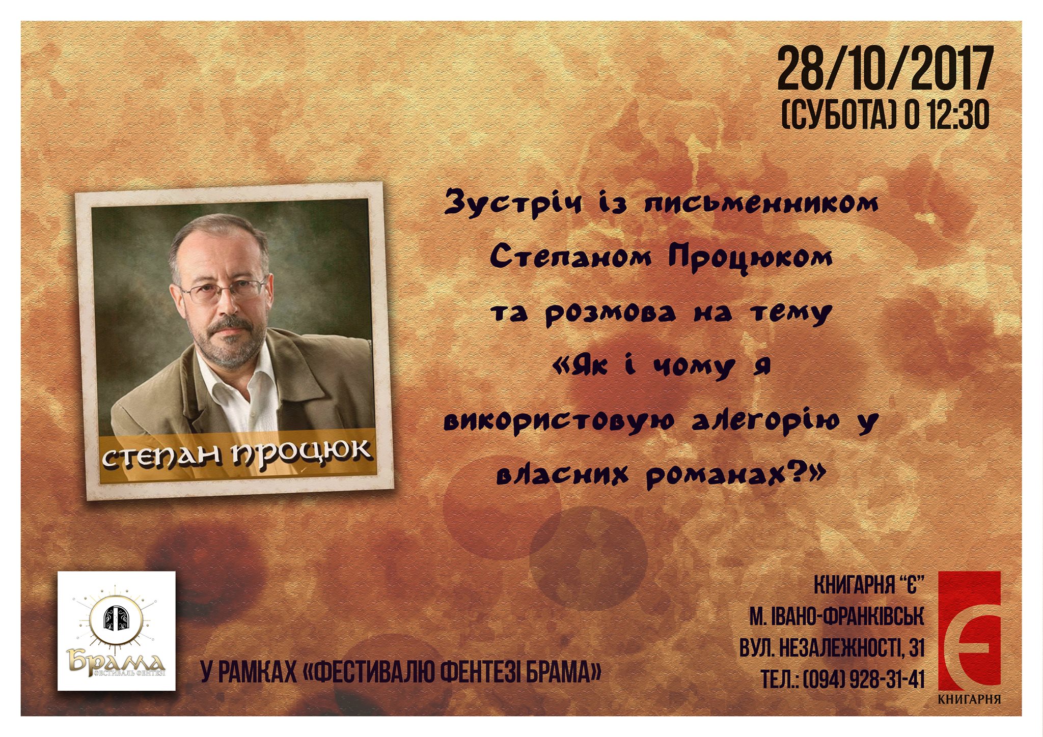 Книгарня "Є". Івано-Франківськ у рамках Брама: фестиваль фентезі запрошує на зустріч із автором Степан Процюк та розмову на тему «Як і чому я використовую алегорію у власних романах?» яка відбудеться у суботу, 28 жовтня.